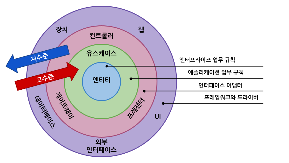 (함수, 클래스, 변수, 엔티티 등) 외부 원에 위치한 어떤 것도 내부 원에 영향을 주지 않아야 한다.