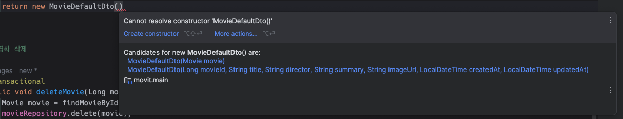 만약, Movie 엔티티를 받아서 MovieDefaultDto 객체를 생성하고 싶다면 아래와 같이 코드를 추가하면 된다.
