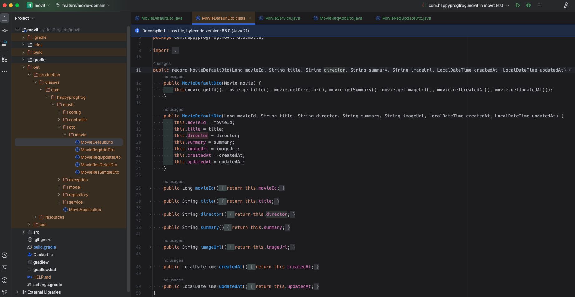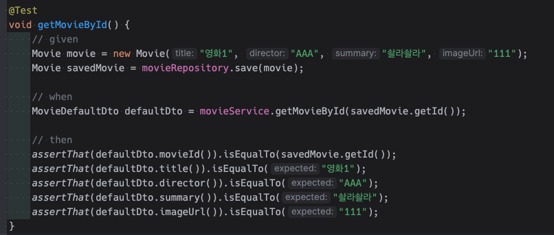 그래서 다음과 같이 defaultDto.movieId()처럼 사용할 수 있다.