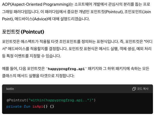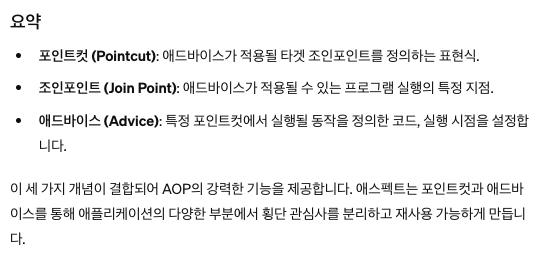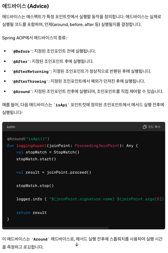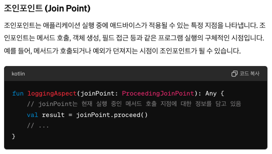 - 조인 포인트를 가져오는 부분 + 조인 포인트를 가져와 어떤 행동을 할 것인지(ex. 로그 출력)