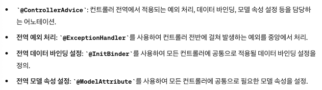 - @ControllerAdvice: 전역적으로 Controller나 RestController에 공통적인 예외처리에 필요한 애노테이션