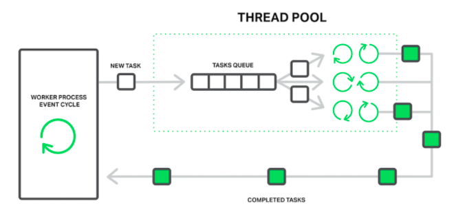 - 비동기(non-blocking) 처리가 가능하고, 이벤트 루프가 계속 돌면서 각각의 워커 프로세스가 태스크를 가져가서 처리