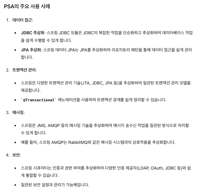 - PSA를 통해 스프링 애플리케이션은 특정 기술에 종속되지 않고, 다양한 서비스 구현체를 쉽게 교체하거나 확장할 수 있다.