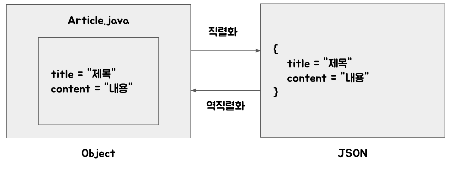 목차 HTTP에서는 JSON을, 자바에서는 객체를 사용 서로 형식이 다르기 때문에 형식에 맞게 변환하는 작업이 필요 직렬화? 자바 시스템 내부에서 사용되는 객체를 외부에서 사용하도록 데이터를 변환하는 작업 역직렬화? 외부에서 사용하는 데이터를 자바의 객체 형태로 변환하는 작업 반응형 공유하기 게시글 관리 개굴개굴 목차 목차 닫기