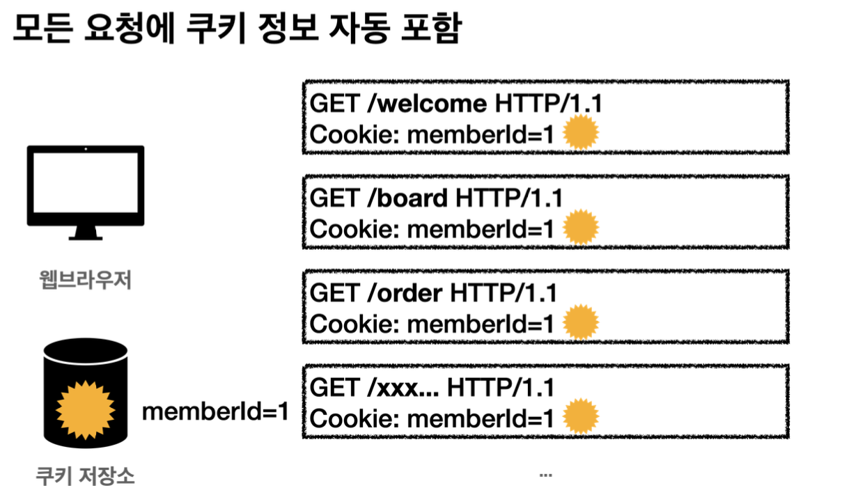 - 문제는 HTTP가 비 연결성(Connectionless)이므로, 서버 입장에서는 해당 사용자가 웹 브라우저를 종료한 것인지 아닌지를 인식할 수 없고 따라서 서버에서 세션 데이터를 언제 삭제해야 하는지 판단하기가 어려움!