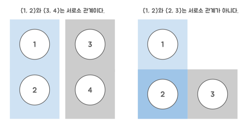 - 공통 원소가 없는 상호 배타적(서로소)인 부분 집합들로 나눠진 원소들에 대한 자료구조를 의미