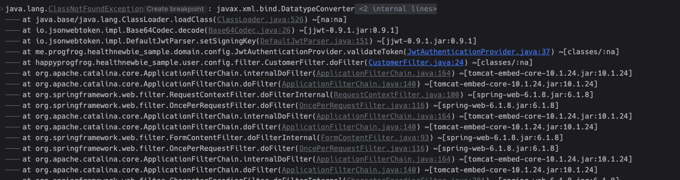 - 이 에러는 javax.xml.bind.DatatypeConverter 클래스를 찾을 수 없어서 발생하는 문제로, Java 9 이상에서 자주 발생한다.