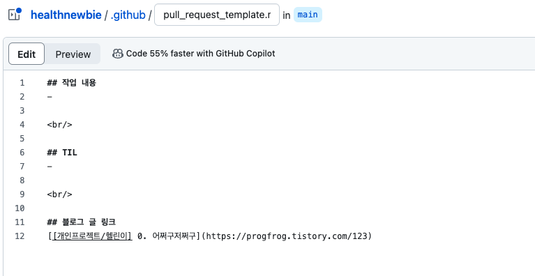 2️⃣ pull_request_template.md 라는 파일을 생성해준다. 위치는 사용자가 원하는 데 지정하는 것이 좋다. 숨겨진 디렉토리에 저장하기 위해 .github 하위에 저장하는 방법이 일반적이다.