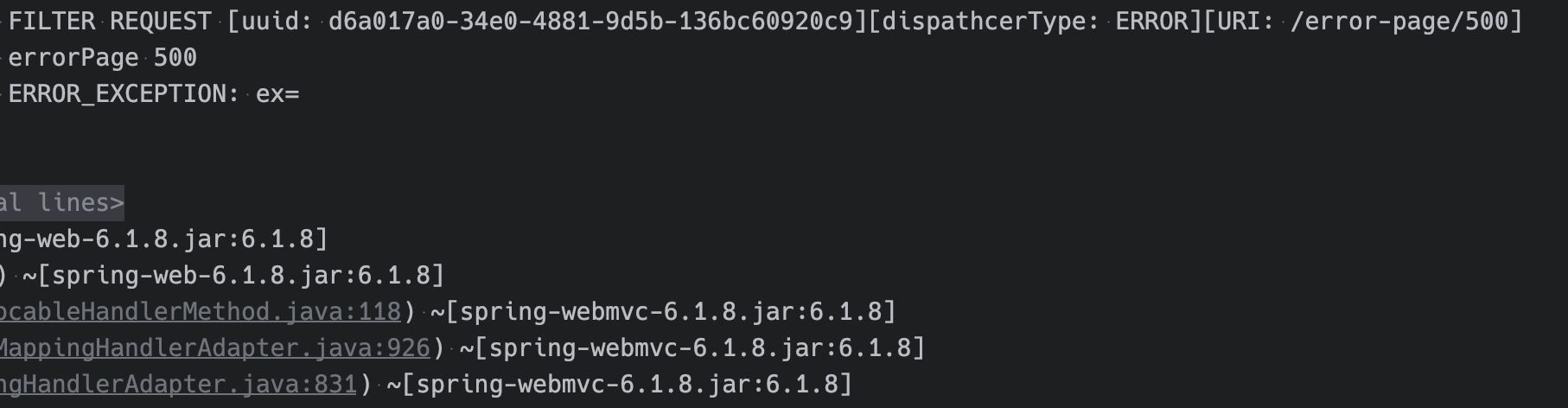 - log.info("FILTER REQUEST [uuid: {}][dispathcerType: {}][URI: {}]", uuid, request.getDispatcherType(), requestURI); 로그가 남는데, 이때 DispatcherType은 ERROR 인 것을 확인할 수 있음