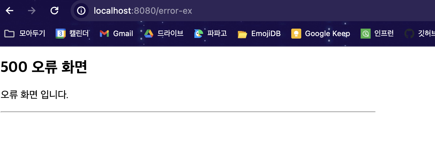 - chain.doFilter(request, response);로 다음 필터나 서블릿 지나서 ServletExController의 "/error-ex"에 매핑된 errorEx() 호출
