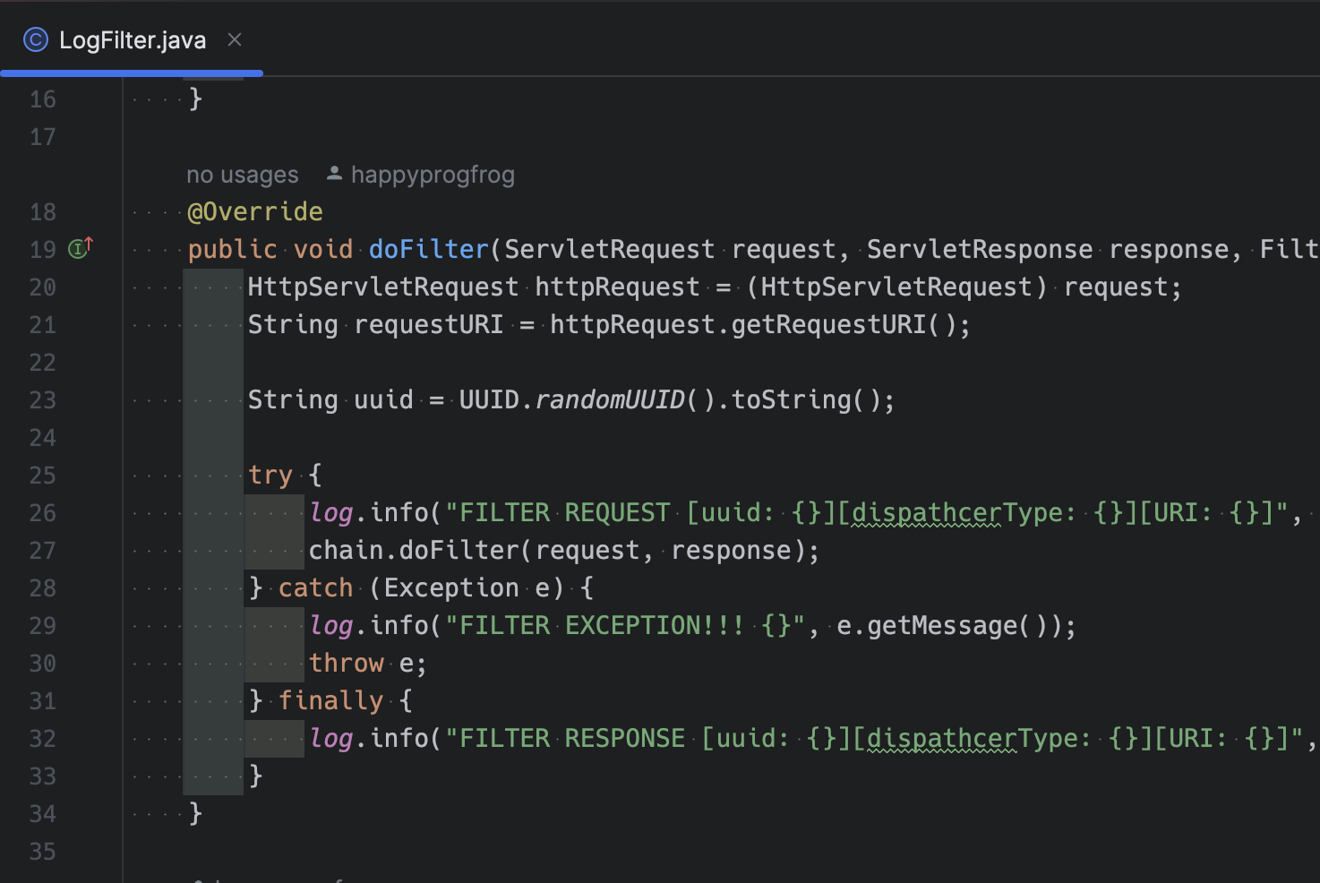 - LogFilter가 호출되어, log.info("FILTER REQUEST [uuid: {}][dispathcerType: {}][URI: {}]", uuid, request.getDispatcherType(), requestURI); 로그 남음