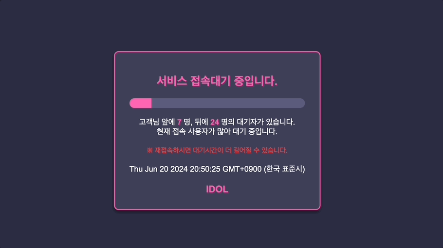 - 타겟 페이지로 접근을 시도했을 때, 입장 가능 상태의 사용자라면 접근을 허용하고 만약 허용되지 않은 사용자라면 대기용 웹 페이지로 리다이렉트 하는 흐름을 가지고 있다.