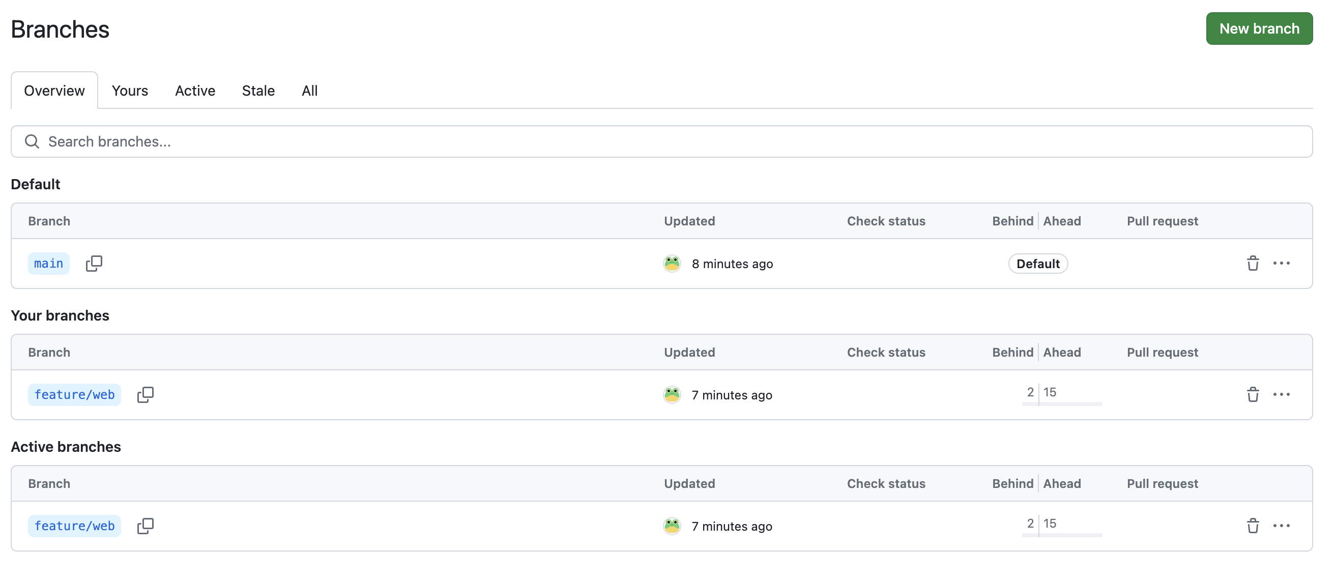 목차 1. View all branches를 선택한다. 2. Overview 탭에서 지우려는 브랜치 우측에 있는 휴지통 버튼을 눌려주면...! 3. 선택한 브랜치가 정상적으로 삭제된 것을 확인할 수 있다. 반응형 공유하기 게시글 관리 개굴개굴 목차 목차 닫기