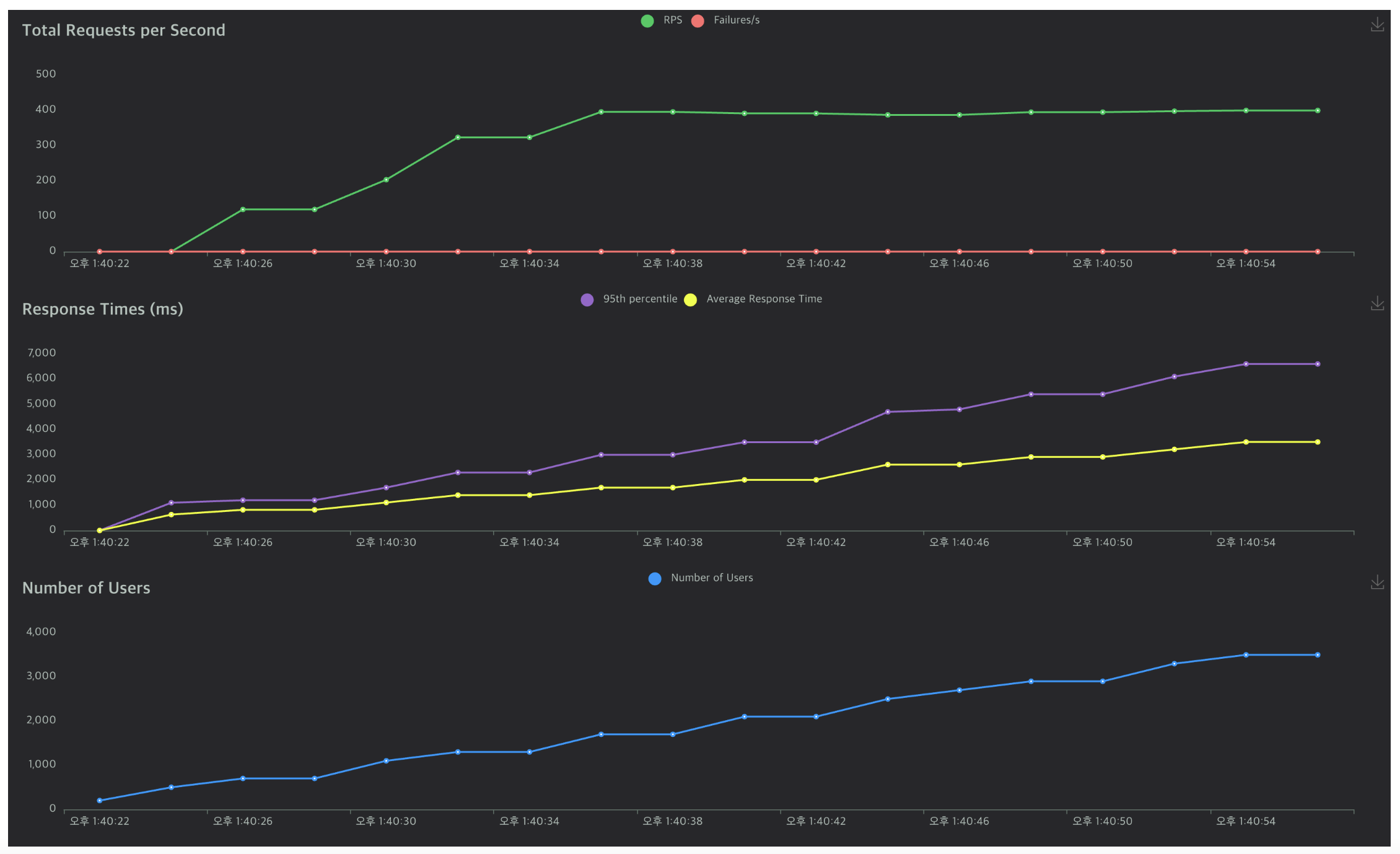다음과 같이 유저수는 점차 늘고, RPS는 400대로 거의 비슷하지만 응답 속도가 점차 느려지는 것을 확인할 수 있다!