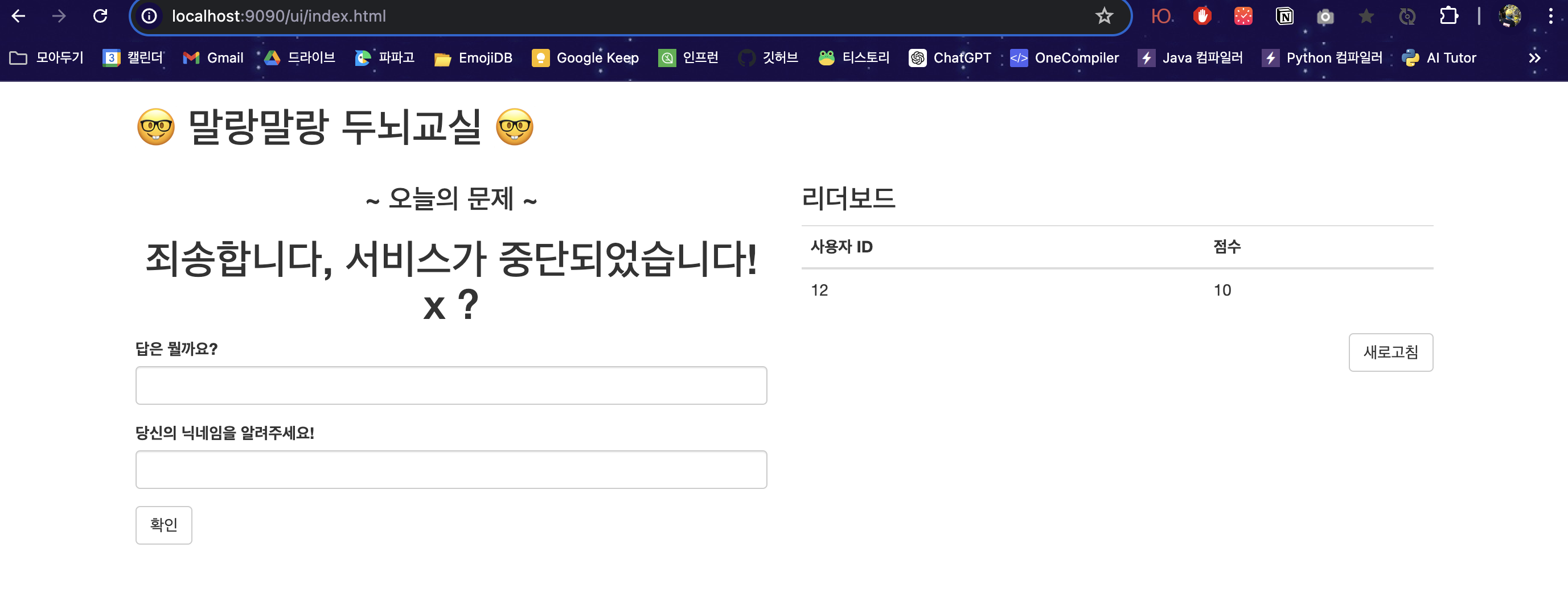 테스트를 해보면, 새로운 버전의 게임화 서비스는 잘못된 곱셈 서비스 URL을 가리키고 있기 때문에, 정답을 보낼 때마다 하이스트릭스가 동작해서 기본 응답을 반환한다.