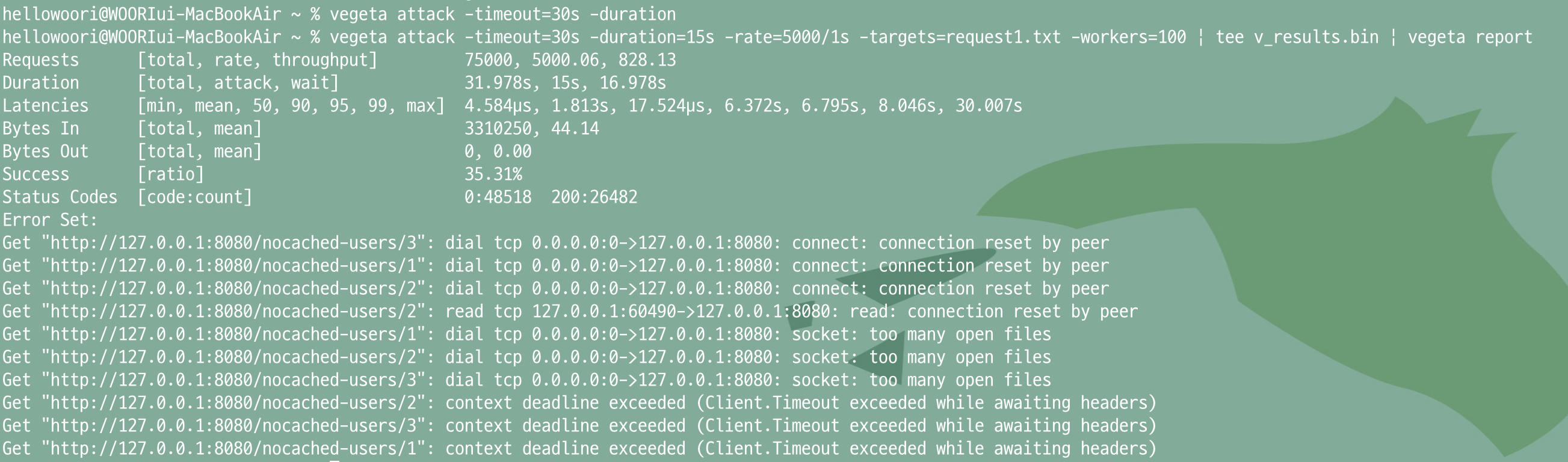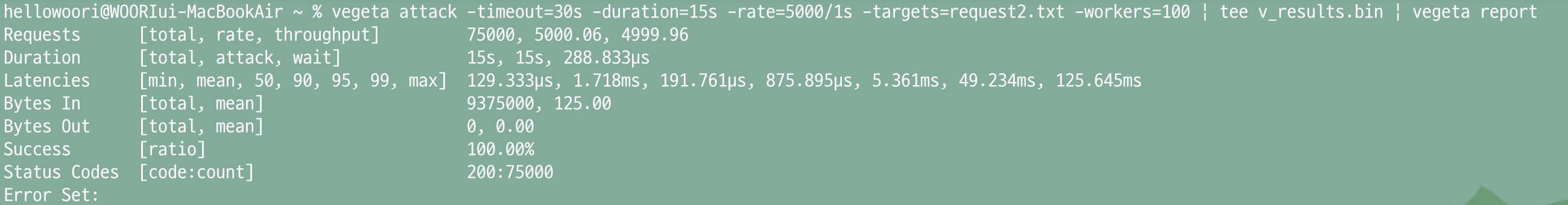 vegeta attack -timeout=30s -duration=15s -rate=5000/1s -targets=request2.txt -workers=100 | tee v_results.bin | vegeta report