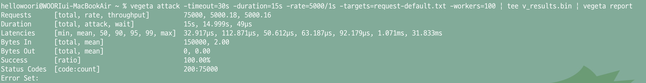 vegeta attack -timeout=30s -duration=15s -rate=5000/1s -targets=request-default.txt -workers=100 | tee v_results.bin | vegeta report