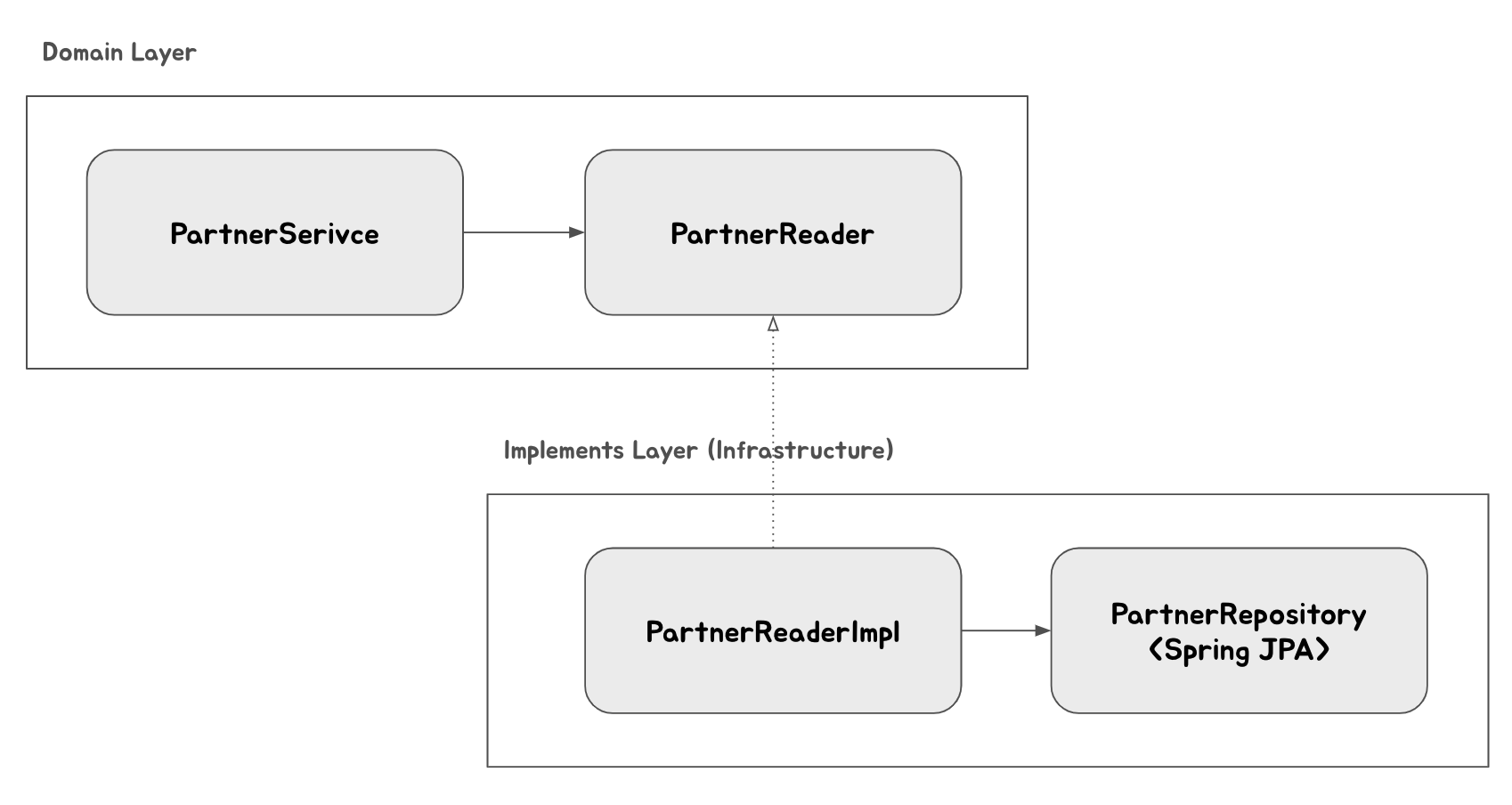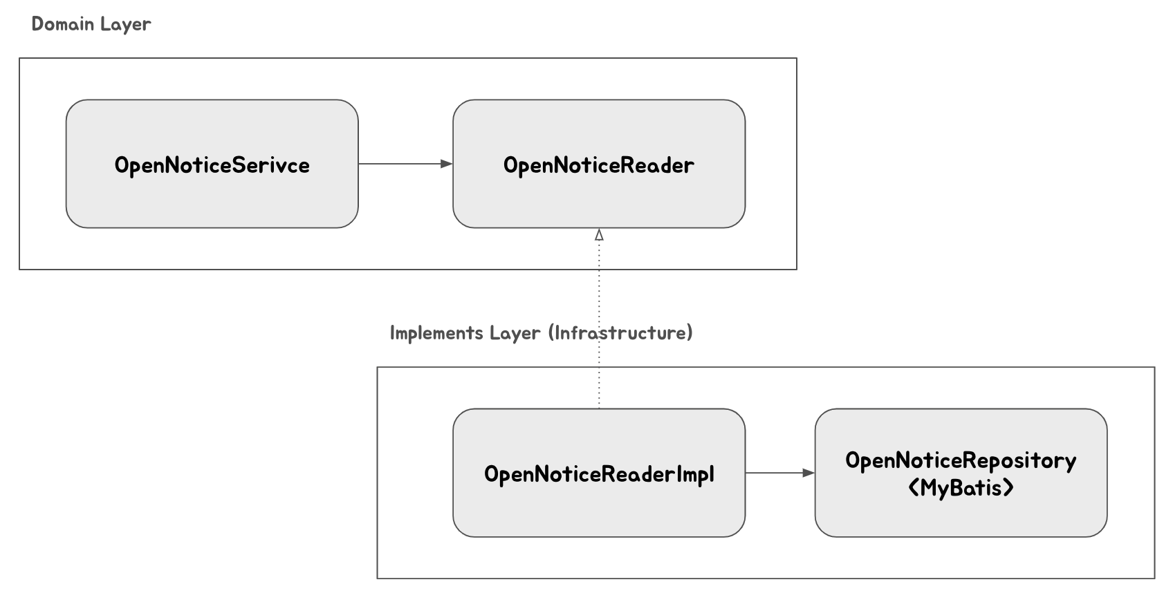 - 즉, domain layer에서는 도메인 로직의 흐름을 표현하고 구현하는 Service와 ServiceImpl이 있지만 그 외의 상세한 구현은 Reader, Store, Executor 같은 interface를 선언하여 사용하고 이에 대한 실제 구현체는 Infrastructure layer에 두고 활용한다 (DIP)