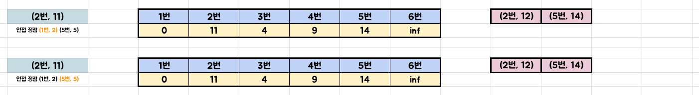 5단계: 우선순위 큐에서 (2번, 11) [정점, 출발 정점과의 거리]를 기반으로 인접한 정점과의 거리 계산