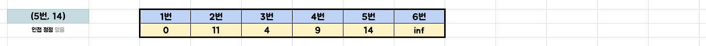7단계: 우선순위 큐에서 (5번, 14) 꺼내고, 인접한 정점이 없으므로 우선순위 큐에 넣을 것이 없음