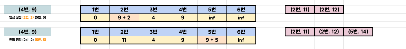 - 업데이트된 거리 (4번, 9)를 우선순위 큐에 넣는다.