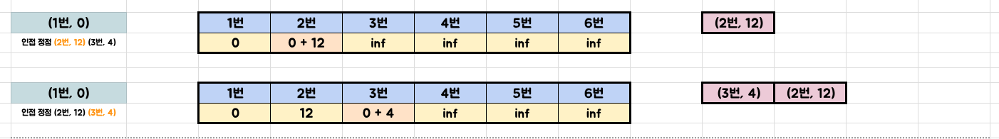 6단계: 우선순위 큐에서 (2번, 12) 꺼내고 건너뜀