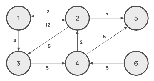 아래의 가중치 방향 그래프에서 1번 정점에서 모든 정점으로의 최소 거리 비용을 출력하는 프로그램을 작성하세요.