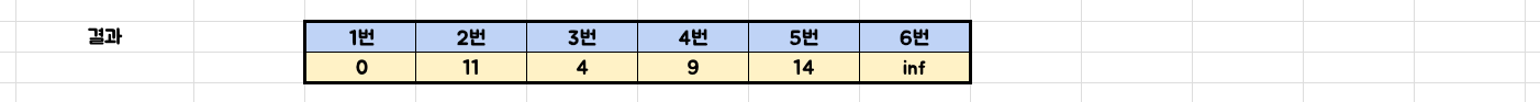 - 이 예시에서 출발 정점은 1번이므로, 1번 정점의 거리는 0이고 나머지는 무한대로 초기화한다.