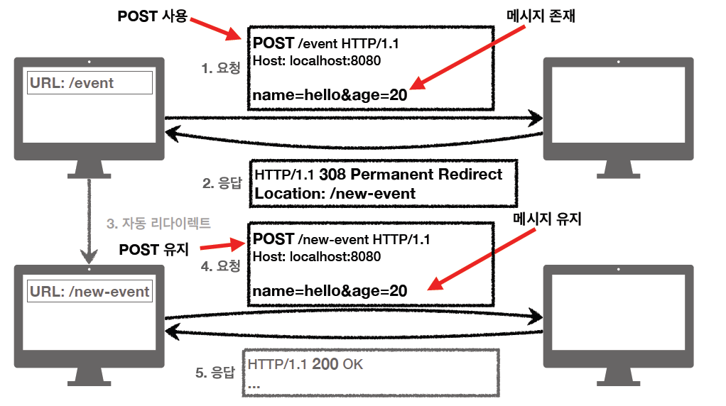 - 리다이렉트 시 요청 메서드와 본문을 유지(처음 POST를 보내면, 리다이렉트도 POST를 유지)